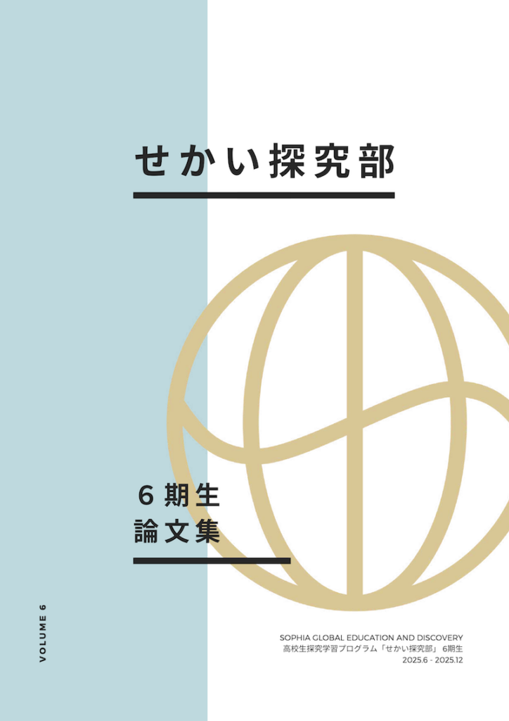 高校生オンライン探究学習プログラム「せかい探究部」修了生の論文集のPDFデータです。高校生のみなさんのいまの興味関心や思考、わくわく感や学びの過程が凝縮された論文作品を収録しています。修了生には、印刷冊子として修了証書と共にお渡ししています。 6期生論文集 PDFダウンロード 6期生(活動期間:2025.6-2025.12)の論文集です。 5期生論文集 PDFダウンロード 5期生(活動期間:2024.6-2025.3)の論文集です。 4期生論文集 PDFダウンロード 4期生(活動期間:2023.6-2024.3)の論文集です。 3期生論文集 PDFダウンロード 3期生(活動期間:2022.6-2023.3)の論文集です。 2期生論文集 PDFダウンロード 2期生(活動期間:2021.6-2022.3)の論文集です。 1期生論文集 PDFダウンロード 1期生(活動期間:2020.6-2021.3)の論文集です。 せかい探究部 プログラムページへ